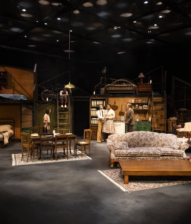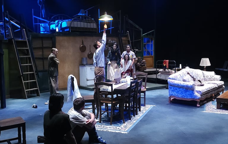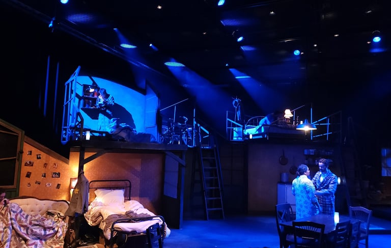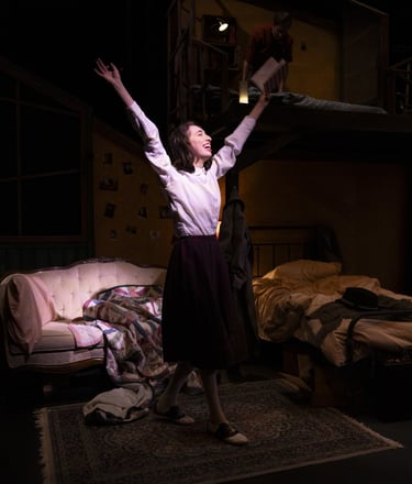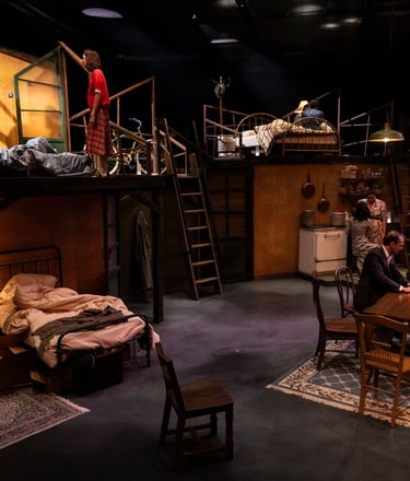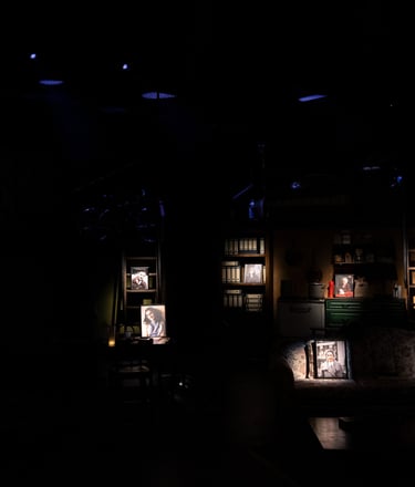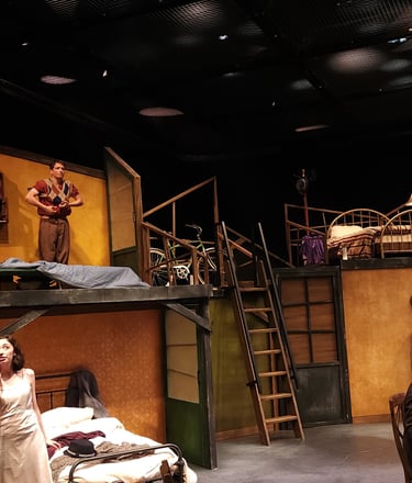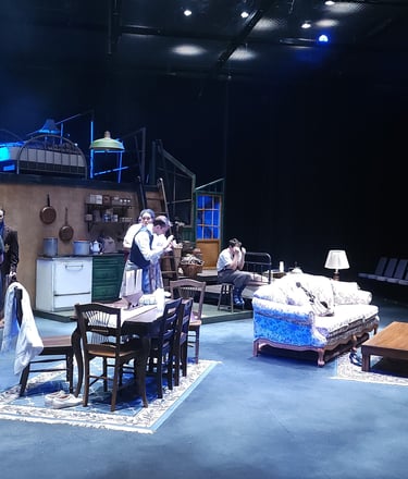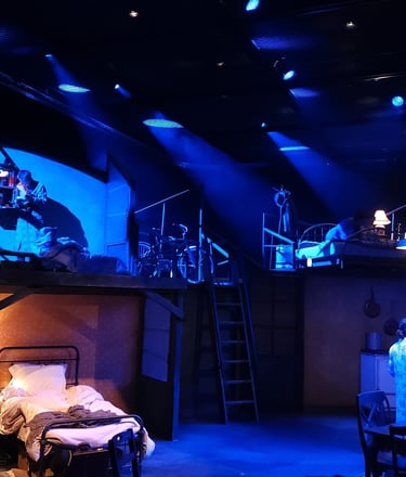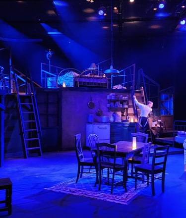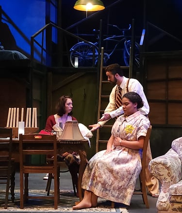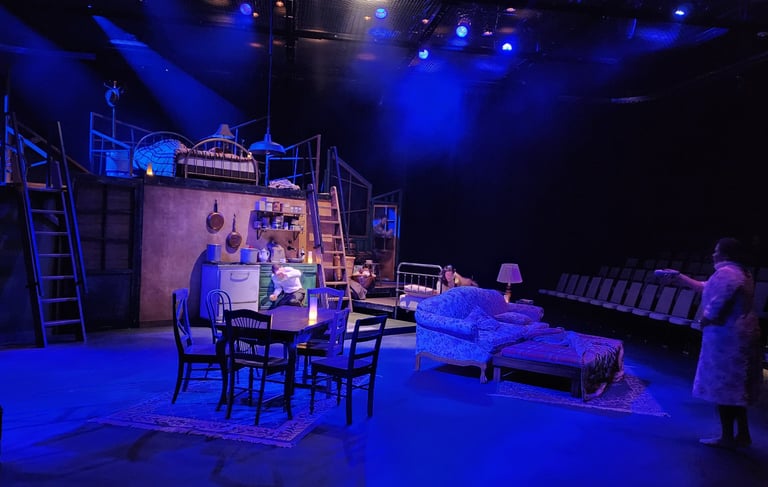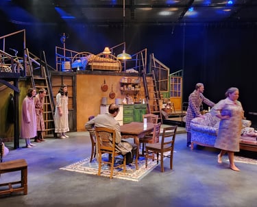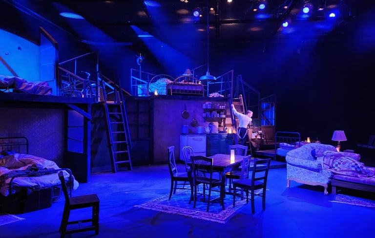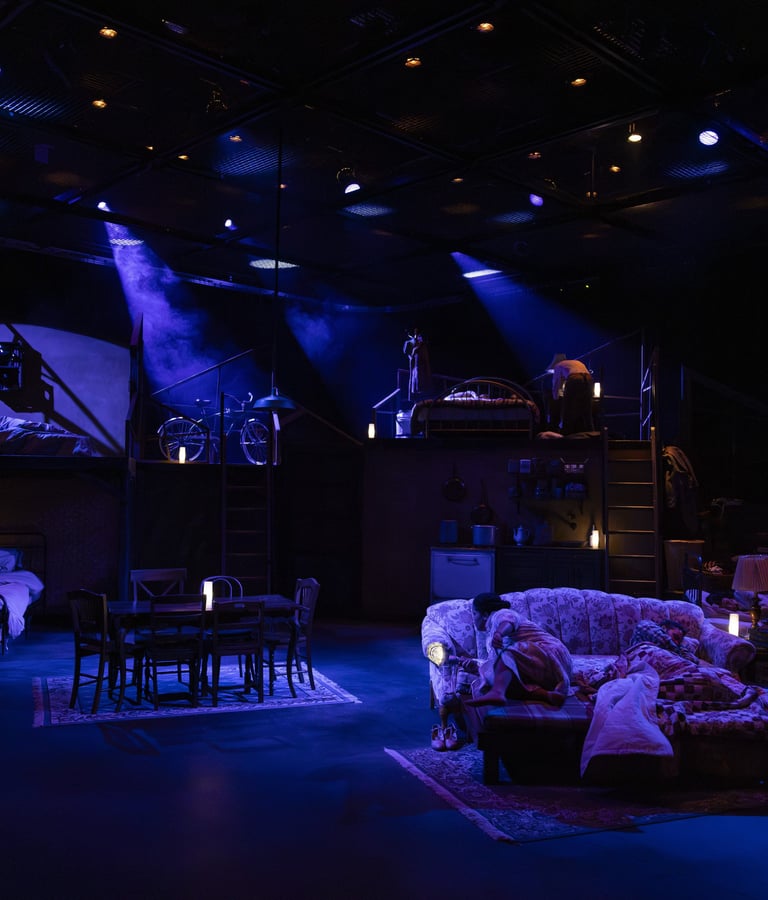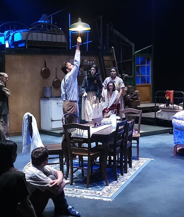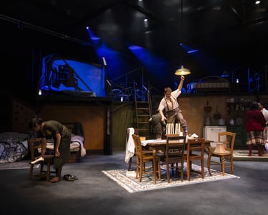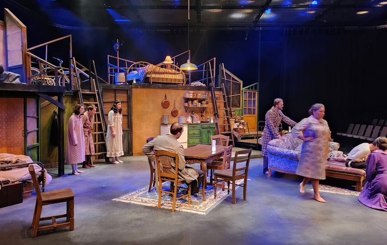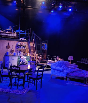 This production presented a unique design opportunity, as director Dr. John Newman envisioned a continuous onstage presence for the entire cast. With actors rarely leaving the set and constantly engaged in action, the lighting design had to carefully balance focus and visibility—ensuring that key moments were highlighted without losing the subtle, layered activity happening across the stage. This approach required a nuanced use of selective lighting and composition to maintain visual clarity while supporting the rhythm and energy of the performance.