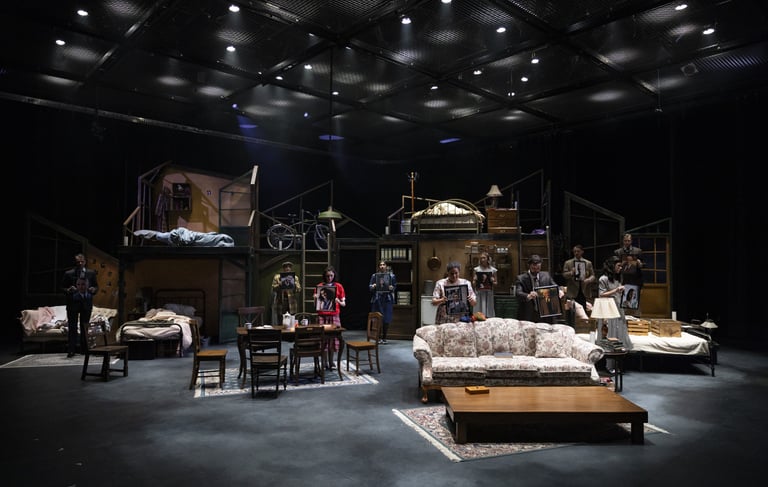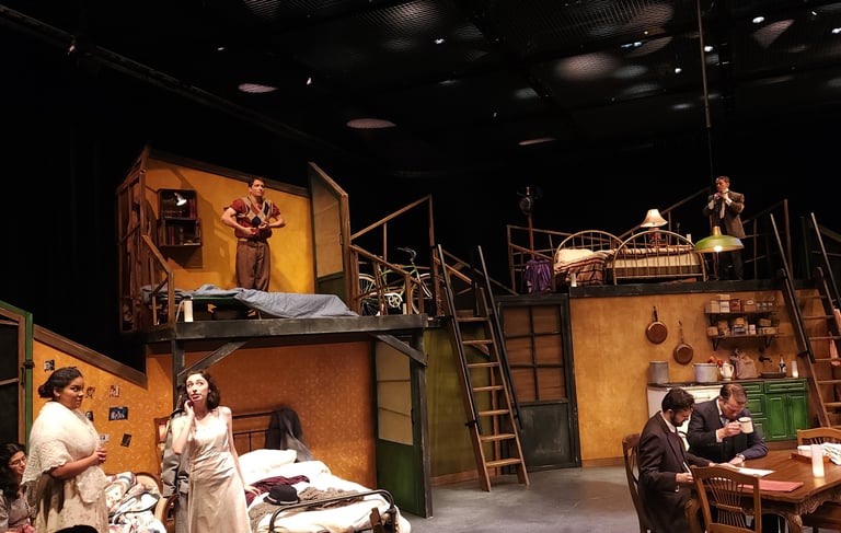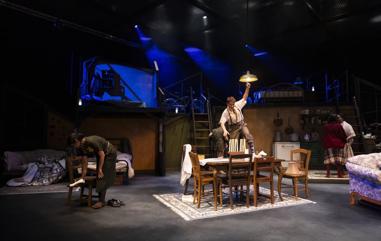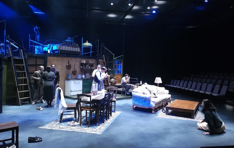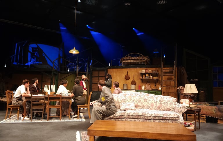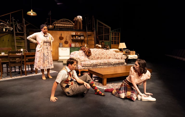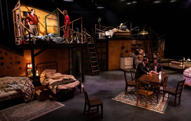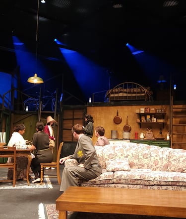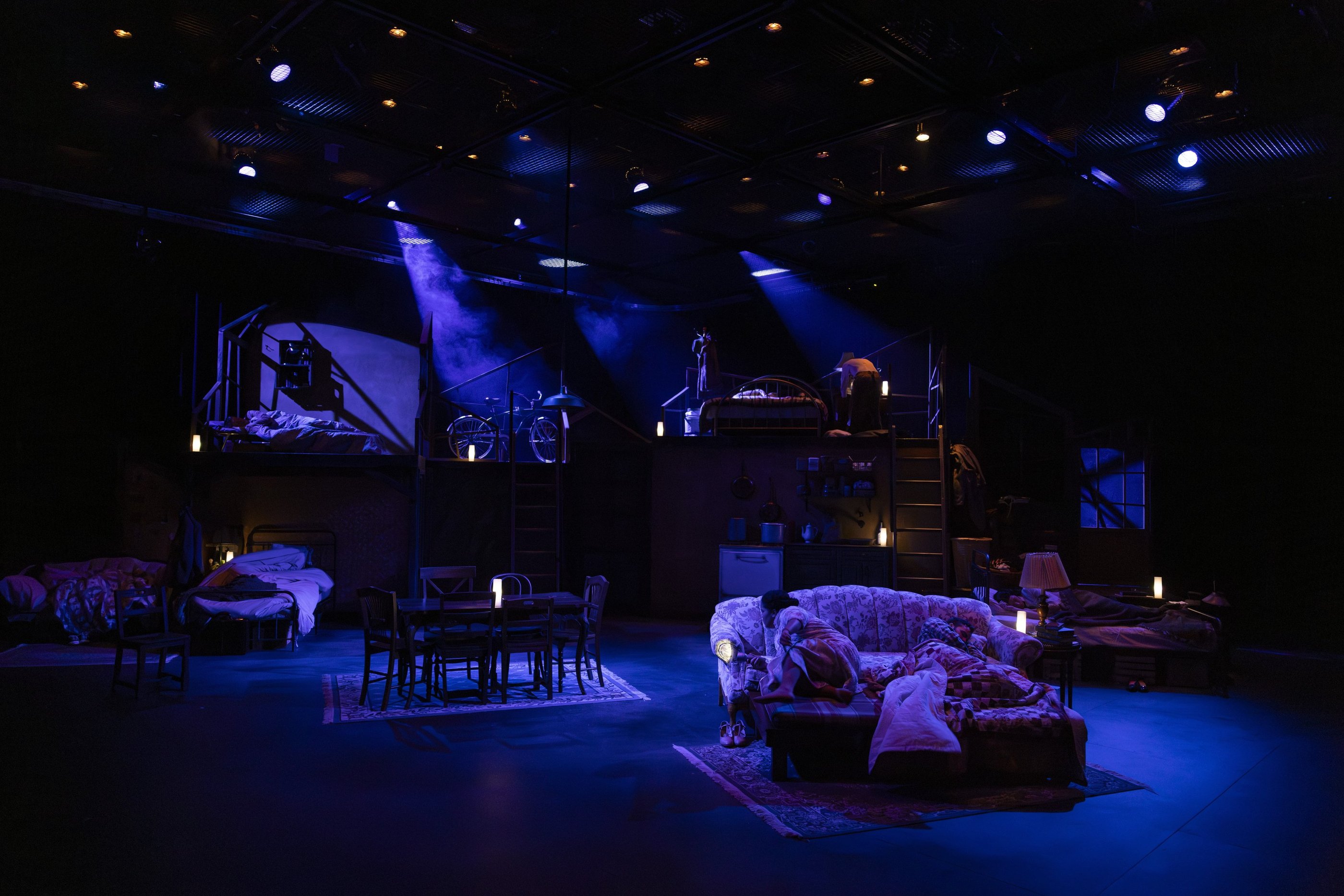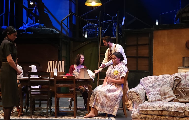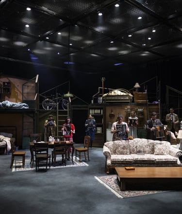 This production presented a unique design opportunity, as director Dr. John Newman envisioned a continuous onstage presence for the entire cast. With actors rarely leaving the set and constantly engaged in action, the lighting design had to carefully balance focus and visibility—ensuring that key moments were highlighted without losing the subtle, layered activity happening across the stage. This approach required a nuanced use of selective lighting and composition to maintain visual clarity while supporting the rhythm and energy of the performance.