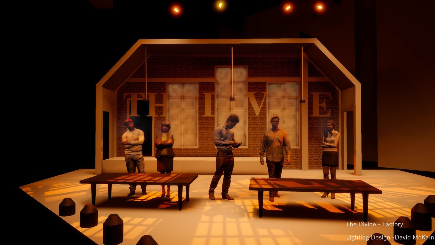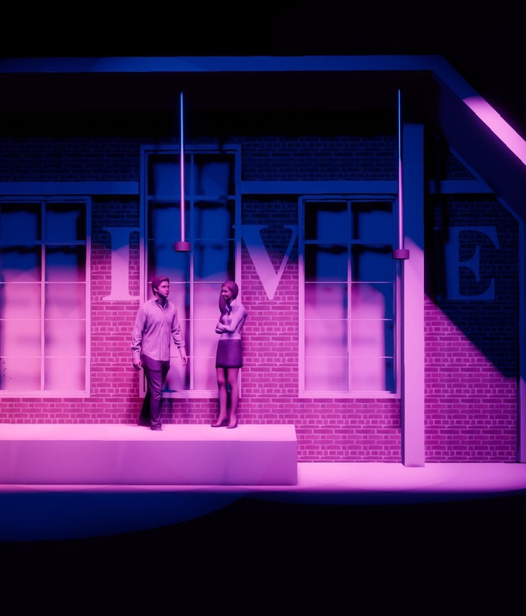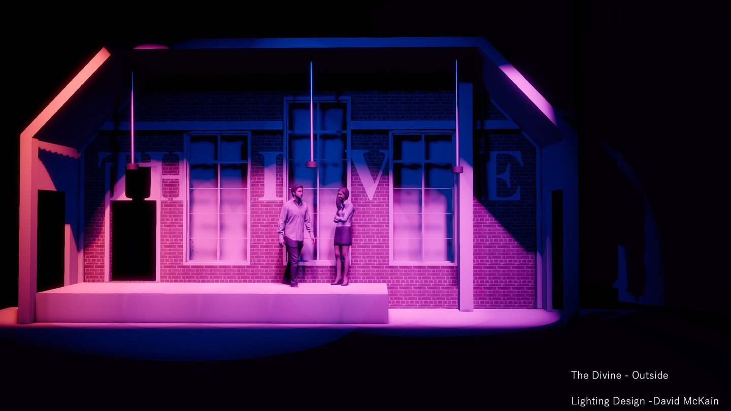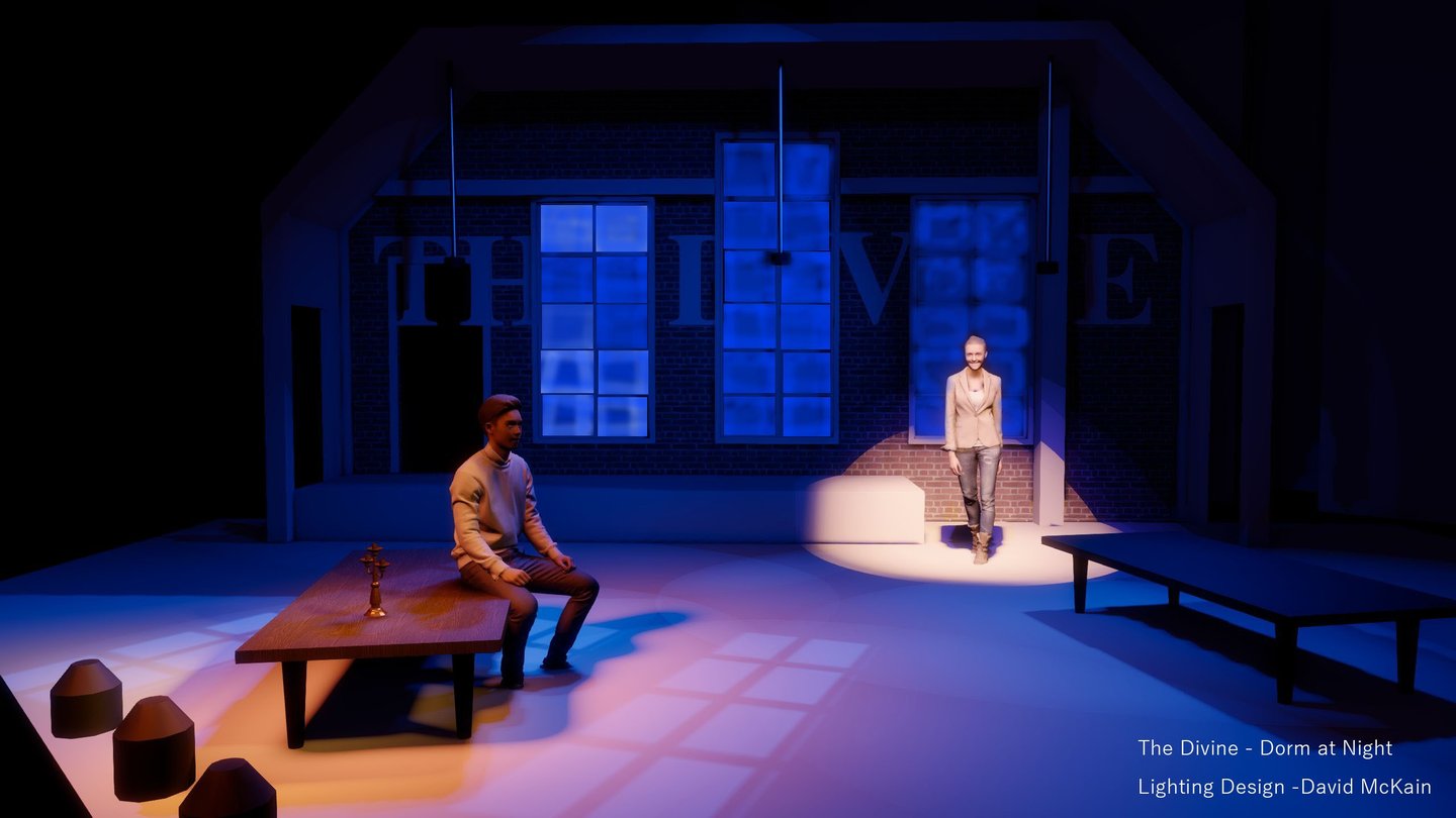 The Divine marked my first mainstage design, and it was a powerful introduction to storytelling on a larger scale. This dramatic piece explores the contradictions of performance—revealing its capacity to both obscure and illuminate truth. The narrative is driven by morally complex characters who make grounded, often unidealized choices, which challenged me to create a lighting design that could support the emotional weight and psychological nuance of the piece. It was an opportunity to use light not just for atmosphere, but to subtly underscore the tension between illusion and authenticity.
